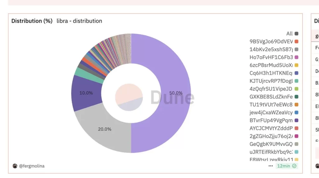 Inmediatamente después del lanzamiento de LIBRA, se hizo evidente que algunas de las billeteras estaban vinculadas a las mismas personas detrás de memecoins anteriores como MELANIA, la moneda que dio la señal de inicio para que el mercado también abandonara la moneda de Trump. Lamentablemente, LIBRA se configuró de manera aún menos favorable en términos de tokenización, lo que permitió un clásico bombeo y descarga. Más del 85% de los tokens de Libra estaban en manos de solo un puñado de billeteras.