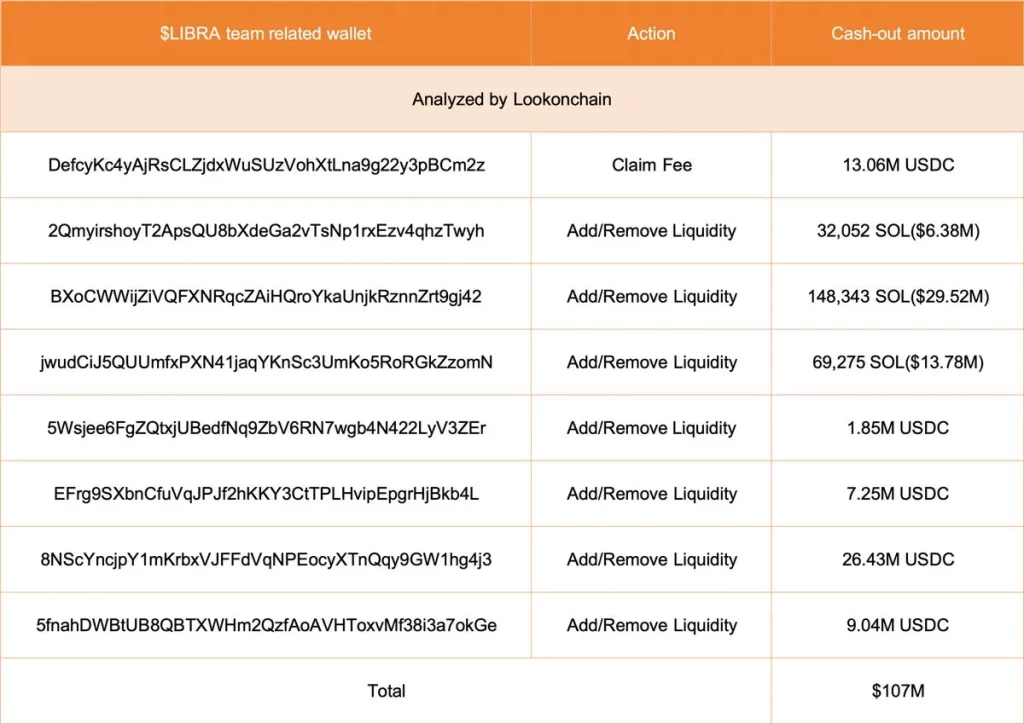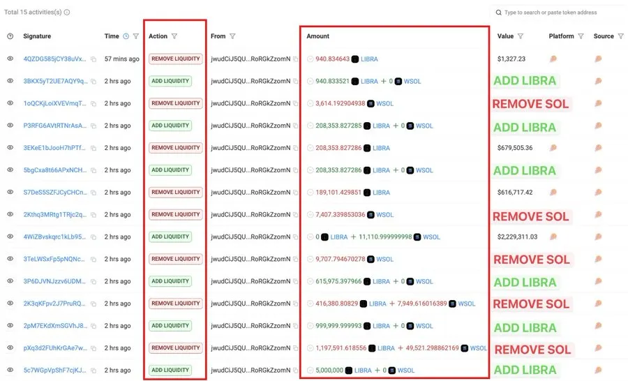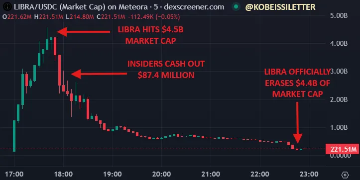 Esto significa que estaban eliminando USDC y SOL, y utilizaron estos fondos de liquidez en lugar de vender en el mercado. LIBRA cayó como una piedra ya que los $87,4 millones en ventas absorbieron toda la presión de compra en la cima.