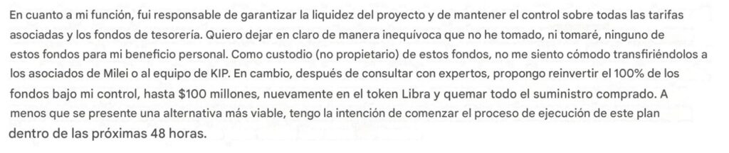 Básicamente, Hayden se encargaba de la parte de liquidez, que ya vimos antes que se agotó por completo en términos de pares, lo que provocó el desplome del precio de LIBRA. Vale la pena destacar un pequeño detalle en este párrafo: “No me siento cómodo traspasándolos a los asociados de Milei o al equipo de KIP”.