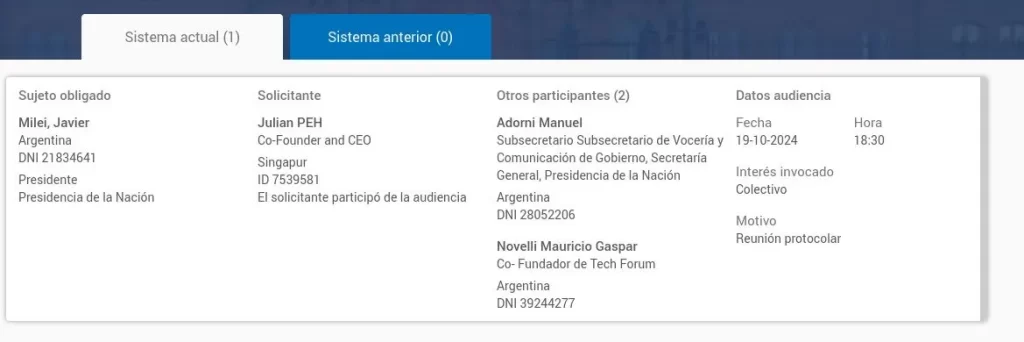 Julian Peh, CEO de KIP Protocol, conoció a Milei en un foro tecnológico en Buenos Aires en octubre del año pasado. Han estado en contacto desde entonces, y hace dos semanas, Milei publicó el siguiente encuentro con un supuesto “emprendedor de blockchain” llamado Hayden Mark Davis, que es literalmente un fantasma en línea y del que nadie en el espacio criptográfico ha oído hablar.