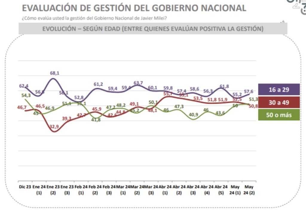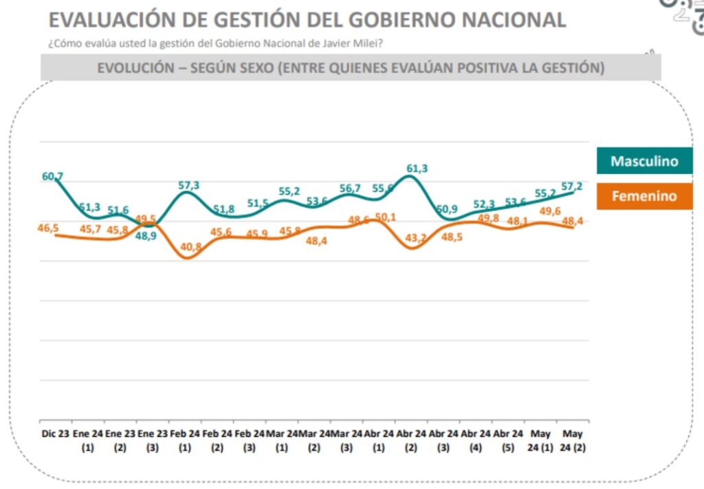“Todo el antiperonismo lo capitaliza hoy La Libertad Avanza”, sentencia Federico Aurelio, director de Aresco. “Milei se comió al PRO, por eso en promedio se le envejeció el electorado y se armó una base más parecida a la de Menem, con ricos y pobres. Se ve también en la distribución por zona geográfica: sigue siendo más fuerte en el Norte, donde es una suerte de rockstar, pero creció mucho en la provincia de Buenos Aires e incluso en el Gran Buenos Aires”, dice Zapata. El último estudio de Opinaia, de Valentín Nabel y Juan Mayol, muestra que los mayores porcentajes de imagen positiva de Milei se registran en los dos extremos de la franja etaria. “Hoy el apoyo es superior entre los mayores de 61 años (63%) que entre los menores de 25 (57%)”, detalla Nabel. En Casa Rosada incorporaron el dato: reconocen incluso que la decisión de atenuar el aumento de las prepagas respondió a una necesidad de atender al sector de adultos mayores, un electorado aportado por JxC que el Gobierno ahora intenta asumir como propio. Un rasgo de la composición original del electorado de Milei, que todavía mantiene entre los que aprueban su gestión, es el diferencial por género. Todos los estudios marcan una mayor popularidad del Presidente entre los varones, con cifras en torno del 60%, que entre las mujeres, de alrededor del 40%.