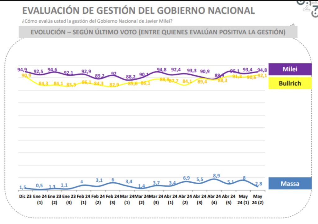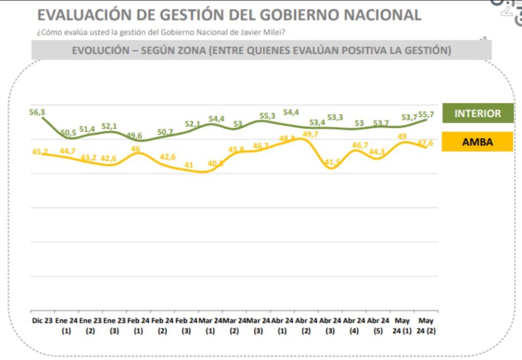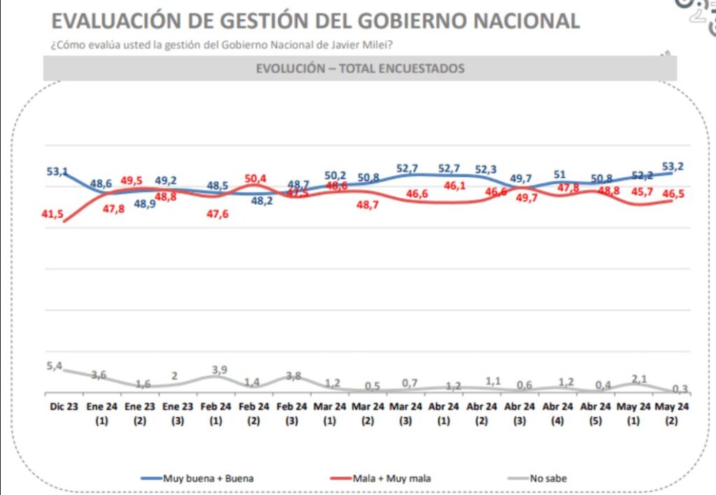 Así surge del análisis de los últimos estudios de opinión de cinco de las consultoras más importantes, a los que accedió el portal web Cenital. Aresco, Trespuntozero, Opinaia, Escenarios y Opina Argentina coinciden en que la imagen del Gobierno se recuperó en mayo, después de una leve caída en abril, y que el respaldo social, de poco más de la mitad de los argentinos, se mantiene inalterable desde diciembre, pese a la caída de 15% de los salarios reales y a una pérdida de 90.000 puestos de trabajo. “Desde 1983 para acá todos los presidentes tuvieron este respaldo o mayor a esta altura del mandato. Lo llamativo es que lo conserve pese a las medidas que tomó. Hay un malestar por el presente con expectativas por el futuro, como si la gente sintiera que el esfuerzo vale la pena”, explica Facundo Nejamkis, director de Opina Argentina, que tiene a Milei con un 53% de imagen positiva.