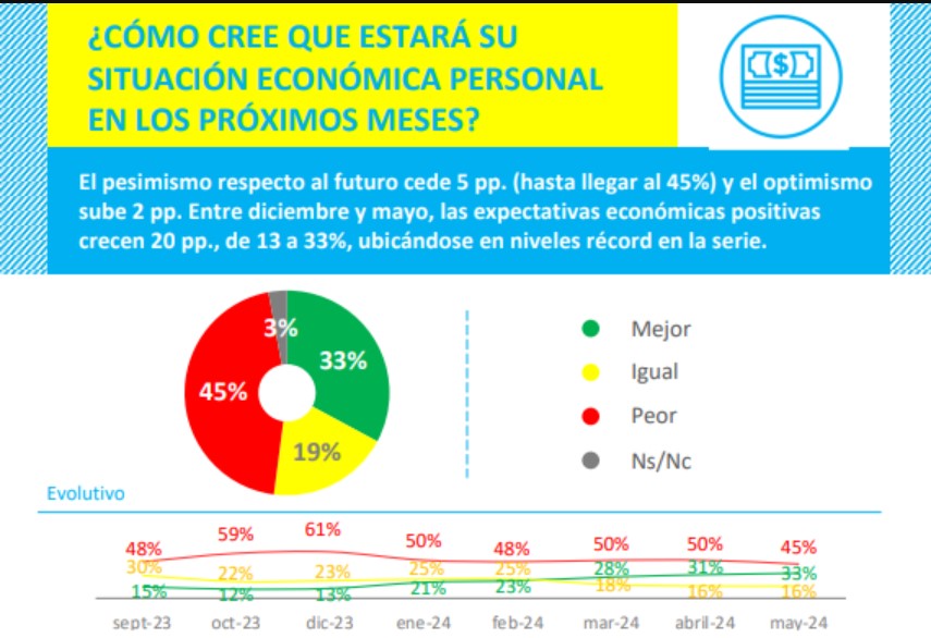 El informe de expectativas económicas de Nejamkis incluye un dato clave: el porcentaje de gente que cree que su situación económica personal estará mejor en los próximo meses creció 20 puntos desde diciembre y hoy se ubica en 33%, marca récord de la serie. En Casa Rosada entienden que la clave del apoyo sostenido al Gobierno radica en un acierto comunicacional del Presidente: “Nunca generó falsas expectativas, siempre dijo que al principio íbamos a sufrir”, dice un colaborador. Consultores y funcionarios coinciden en que la caída leve de abril obedeció al conflicto universitario, que en Casa Rosada procuran dar por superado. “Esa bala nos entró, porque en la marcha hubo votantes nuestros, que nos dijeron ‘con esto, no’”, agrega el colaborador del Presidente.