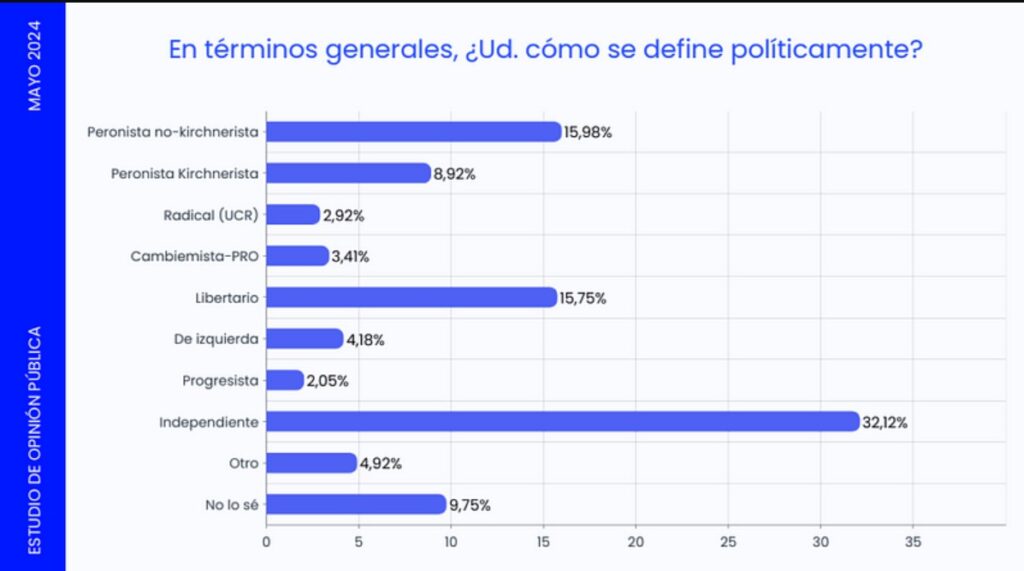 En este sentido, es revelador un cuadro del último estudio de Escenarios, que muestra la evolución de identidades políticas autopercibidas. Los independientes encabezan la tabla, con un 32%. Ese porcentaje cayó en mayo, al igual que la identidad kirchnerista, que viene en un largo declive y ya está por debajo del 9%. En cambio, hay dos identidades que vienen escalando posiciones: los peronistas no kirchneristas y los que se definen como libertarios, las dos casi en 16%. “La crisis de la oposición es muy grande. Milei es la única bolilla en el bolillero. Encuentra cierto apoyo en el peronismo no kirchnerista, el que votó a Schiaretti, y hasta en una parte de los que votaron a Massa”, dice Federico Zapata, director de Escenarios.