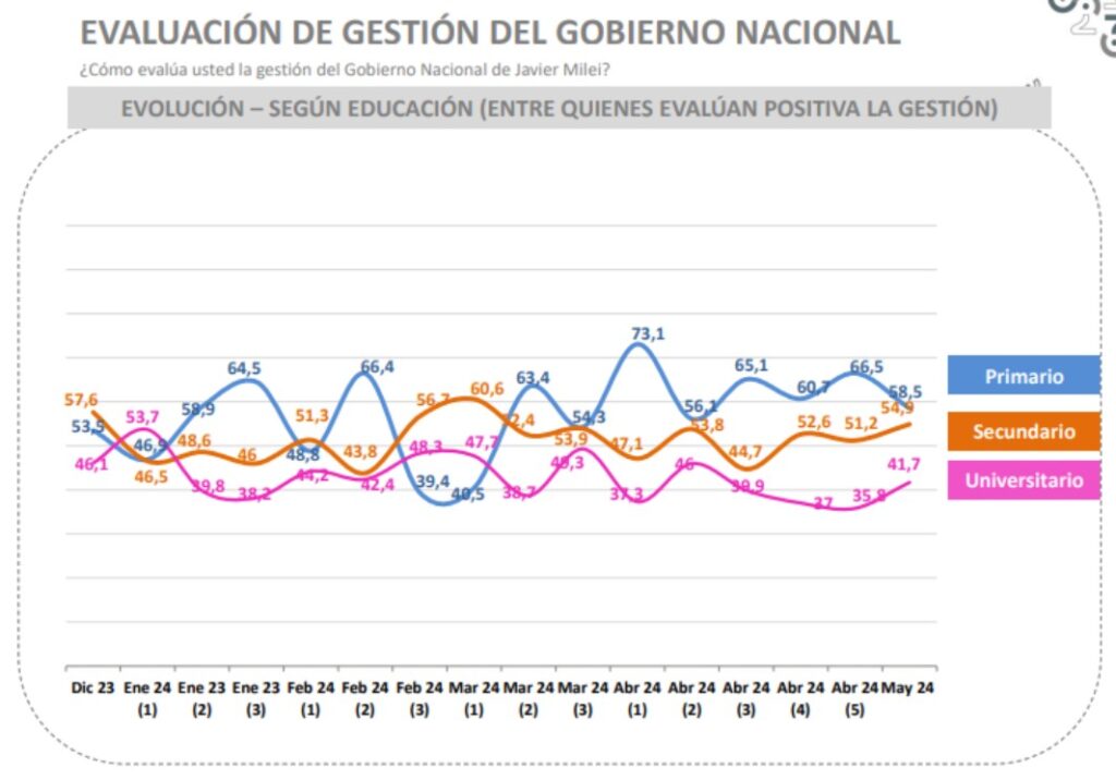 Otro dato interesante es que la grieta socioeconómica que separó durante los últimos veinte años a los electorados del peronismo y del antiperonismo parece haber perdido utilidad para entender el nuevo escenario. Lo muestra muy bien el último estudio de Trespuntozero, con un desagregado sobre el respaldo al Presidente de acuerdo con el nivel educativo de los consultados. Es el dato que suelen usar las consultoras para deducir el nivel socioeconómico. El apoyo al Gobierno entre quienes solo terminaron la primaria se ubicó este mes en un 58,5%, cinco puntos por encima del nivel de diciembre. Entre quienes solo terminaron la secundaria alcanzó el 54,9% y entre los egresados universitarios, el 41,7%. Coinciden con ese diagnóstico los estudios de Escenarios y Opina Argentina: a mayor nivel educativo, menos respaldo al Gobierno. “El apoyo entre los sectores populares creció 20 puntos desde octubre. Los universitarios suelen ser más reactivos a figuras como Milei, pasa lo mismo con Bolsonaro y con Trump”, analiza Nejamkis.