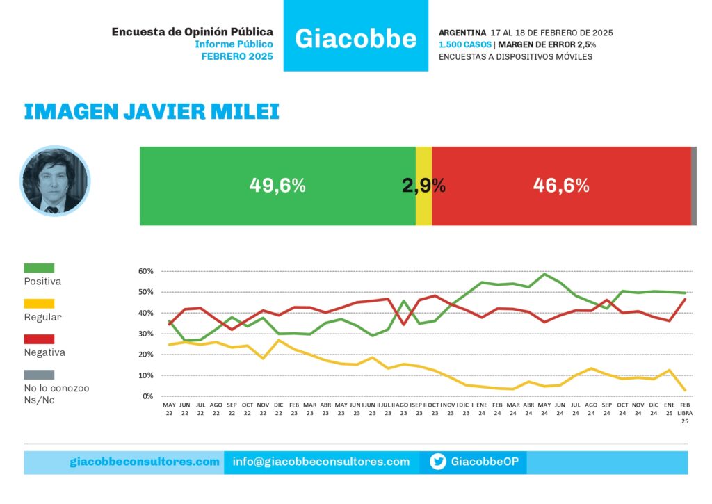 Una encuesta de la consultora Giacobbe & Asociados (Jorge Giacobbe) dio cuenta del impacto del criptogate en la opinión pública sobre la imagen del presidente Javier Milei. El trabajo, sobre una muestra de 1500 consultados, mostró fluctuaciones en la consideración de los votantes.
