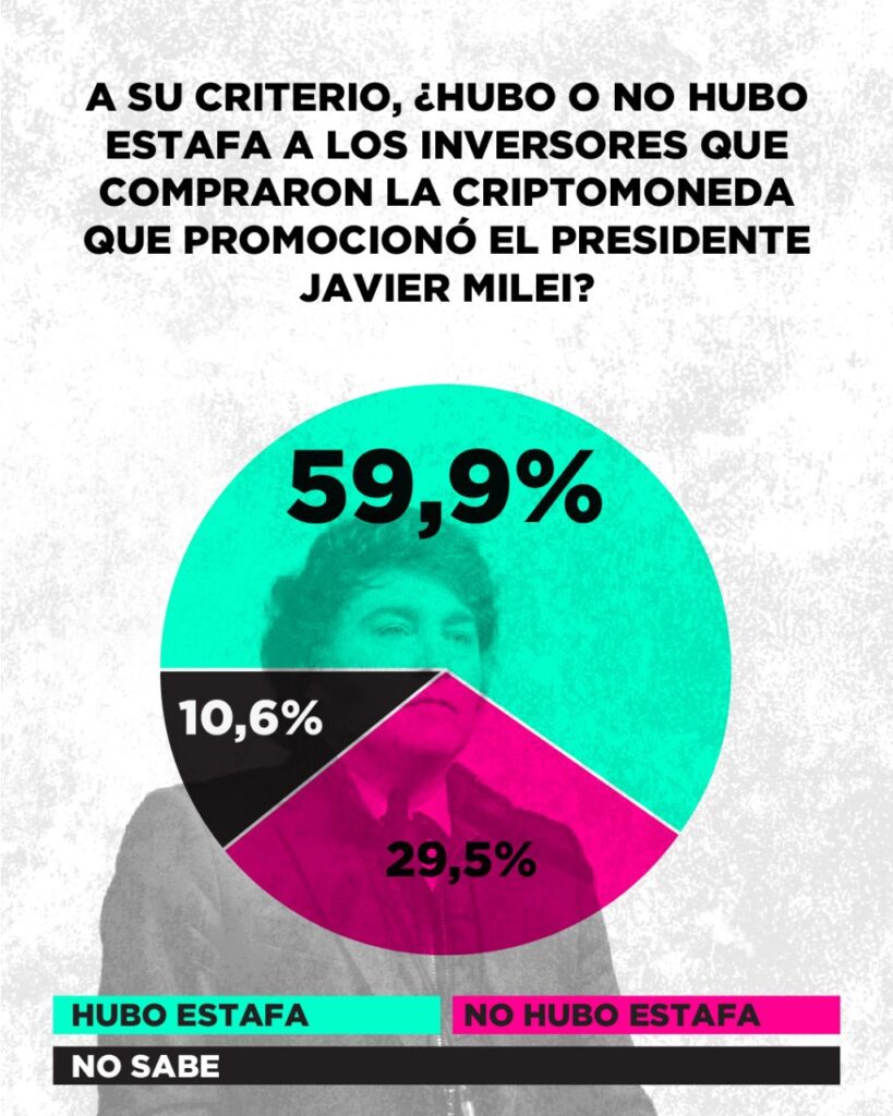 A la frase “El criptogate es la mayor crisis de que asumió Milei” el 66,7% de las personas contestaron estar de acuerdo. El 24,9%, contestó no estar de acuerdo con esa afirmación. Y a la pregunta de si hubo estafa los números son más preocupantes para el Gobierno: casi el 60% contestó que sí.