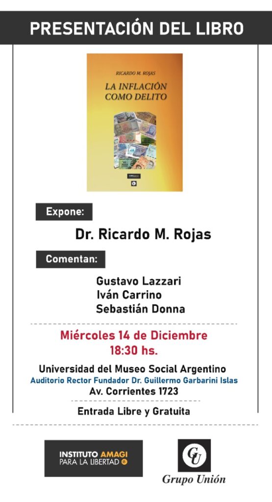 “La inflación como delito” es un libro promovido por Instituto Amagi para la Libertad y Unión Editorial que recorre la historia del dinero, los precios, la inflación y sus causas y que llega a la conclusión de que el único responsable es el Estado y su emisión forzosa. Iván Carrino, Gustavo “Lacha” Lázzari y Sebastián Donna comentarán estos conceptos en la presentación del libro el próximo 14 de diciembre a partir de las 18.30.