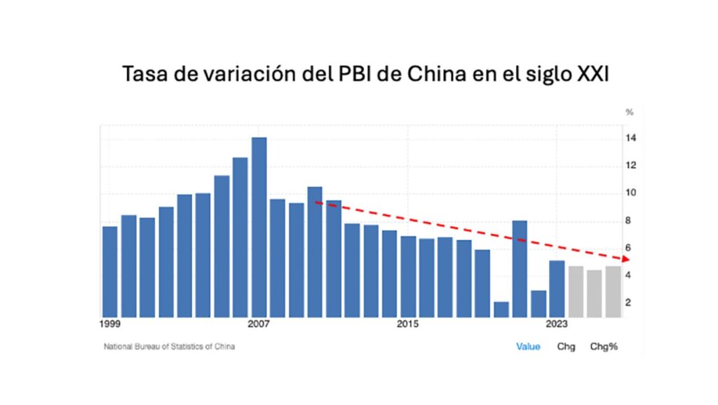 2- Tomado el forecast de crecimiento del PBI 2024/2026 del National Bureau of Statistics of China (NBSC), la tasa de variación del PBI de China tiene marcada tendencia descendente, cayendo a menos de la mitad entre 2010 (+10,6%) y 2026 (+4,8%). Un fenómeno que no sorprende, ya que la teoría del crecimiento económico lo explica y anticipa.