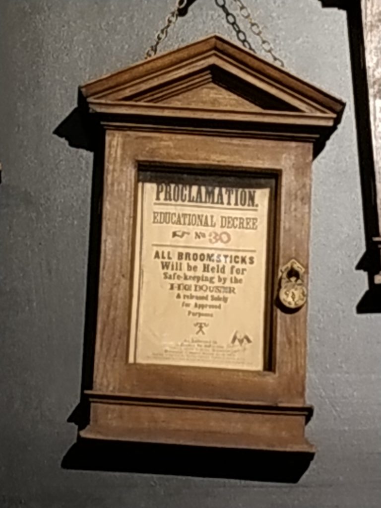 Los “úcases” ministeriales se van colgando en una pared del castillo donde funciona Hogwarts, revelando un proceso de inflación legislativa mediante el que se sofocan lenta e inexorablemente los derechos más elementales. En los estudios de Warner localizados en las afueras de la ciudad de Londres, uno de los muchos elementos que se exhiben está configurado justamente por los cuadritos de tales “decretos”, cuya lectura, de no tratarse de ficción, resultaría estremecedora.