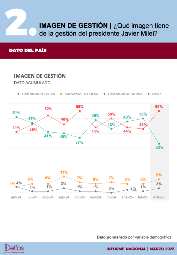 Una caída en dimensión similar registró el estudio de la consultora Delfos de los últimos días, que tiene a la gestión de Milei cayendo 17 puntos de un mes a otro, de 50% en febrero a 33% en marzo. La imagen de la gestión es uno de los dos únicos datos a los que el presidente le presta especial atención en las encuestas. El otro es su propia imagen, que también registró un impacto a la baja en el estudio de Delfos, aunque no tan salvaje: entre febrero y marzo, subió dos puntos la negativa y bajó en igual proporción la positiva. En intención de voto, la merma es aun menor: los libertarios pierden 1,6 puntos de un mes a otro.