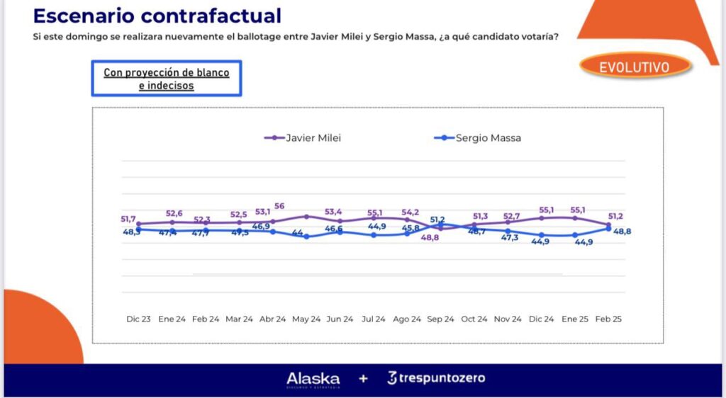 Ese no traslado de la crisis a la medición electoral es uno de los datos del momento. No sólo lo midió Delfos, sino que aquel consultor que registró la caída de 13 puntos de imagen en el núcleo duro, también registró una variación de apenas dos puntos a la baja en la intención de voto. Hay algunas hipótesis sobre por qué se dan esas diferencias. En principio, la inexistencia de una figura opositora que logre captar el desencanto aparece hoy como una de las principales fortalezas de Milei. Resulta interesante, en ese sentido, el escenario contrafactual que todos los meses elaboran Juan Courel (Alaska) y Shila Vilker (Trespuntozero), volviendo a medir el ballotage entre Milei y Sergio Massa como si fuera hoy. En el último relevamiento, la diferencia fue de 1,2% a favor del actual presidente. Para encontrar una distancia igual de cerrada en el mismo estudio hay que remontarse a seis meses atrás, en septiembre del 2024, cuando el país atravesaba días de inestabilidad cambiaria y el dólar blue, al igual que este martes, que cotizaba en $1.285.
