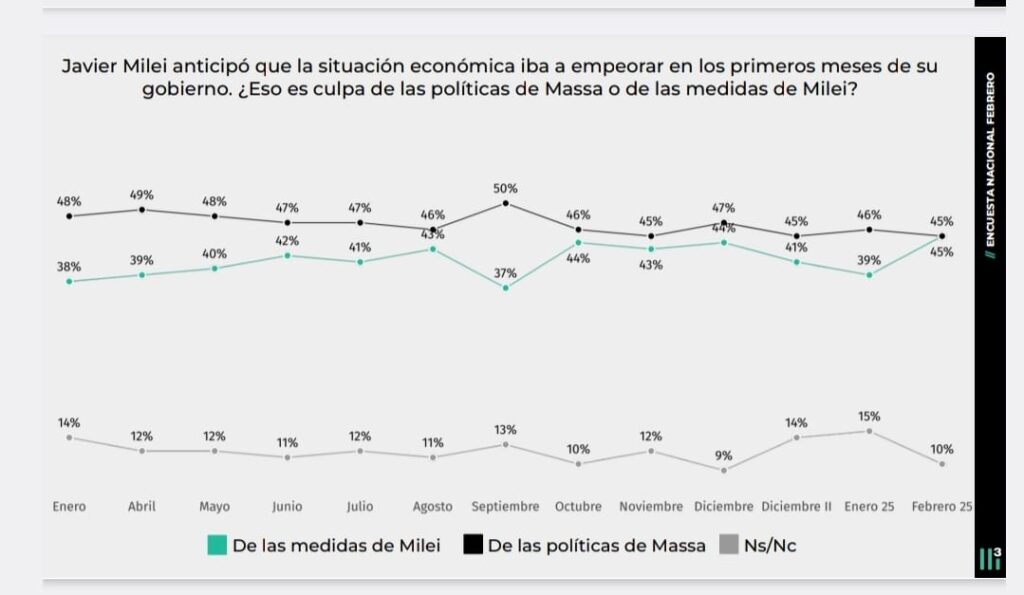 Las encuestas muestran una crisis dentro del Gobierno en toda línea. Desde hace un mes y medio, el Presidente y su equipo perdió el control de la calle, del Congreso, de los mercados y hasta de la conversación pública. Pese a todo eso, Milei baja mucho en imagen, pero no cae en intención de voto. Algunos datos preocupan dentro del núcleo duro de La Libertad Avanza: la criptoestafa le costó al presidente 13 puntos en su imagen positiva entre votantes liberales y del PRO, si el balotaje Milei-Massa fuera hoy la diferencia sería de 1,2% a favor del actual presidente y que la responsabilidad por la crisis económica actual sería “miti-miti” entre estos dos.