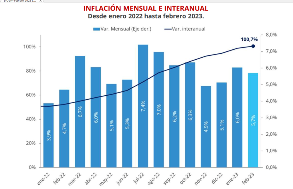Como resultado, ya son 13 meses consecutivos en los que la inflación se acelera en términos interanuales, llegando a duplicarse desde el valor de enero del 2022 (50,7%). A su vez, durante el primer bimestre del año, la inflación acumulada llegó a 12,1%, cifra que supera al 8,8% del mismo período del 2022.