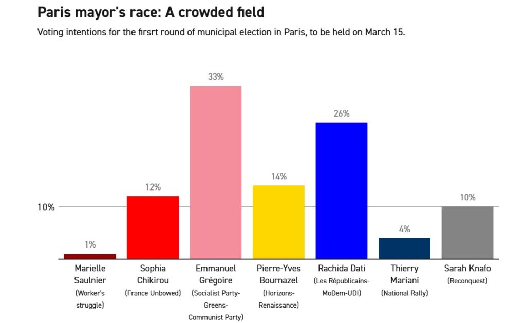 El candidato socialista Emmanuel Grégoire lidera la contienda con el 33% de los votos, según la encuesta. Le sigue Rachida Dati, la ministra de Cultura conservadora, con el 26%. El centrista Pierre-Yves Bournazel obtuvo el 14%, mientras que Sophia Chikirou, del partido de extrema izquierda France Unbowed, obtuvo el 12%.