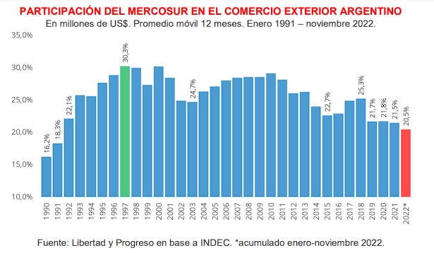 En 2022, la participación del Mercosur (MCS en adelante) en el comercio internacional argentino anotó su tercer año consecutivo de caída, y representó 20,5% del total. En el acumulado enero-noviembre de este año, la suma de las exportaciones e importaciones argentinas al MCS llegó a US$ 32.517 millones sobre un total comerciado con el mundo de US$ 158.786 millones. El máximo nivel histórico fue en 1997 cuando representó el 30,3% de los totales exportados e importados.