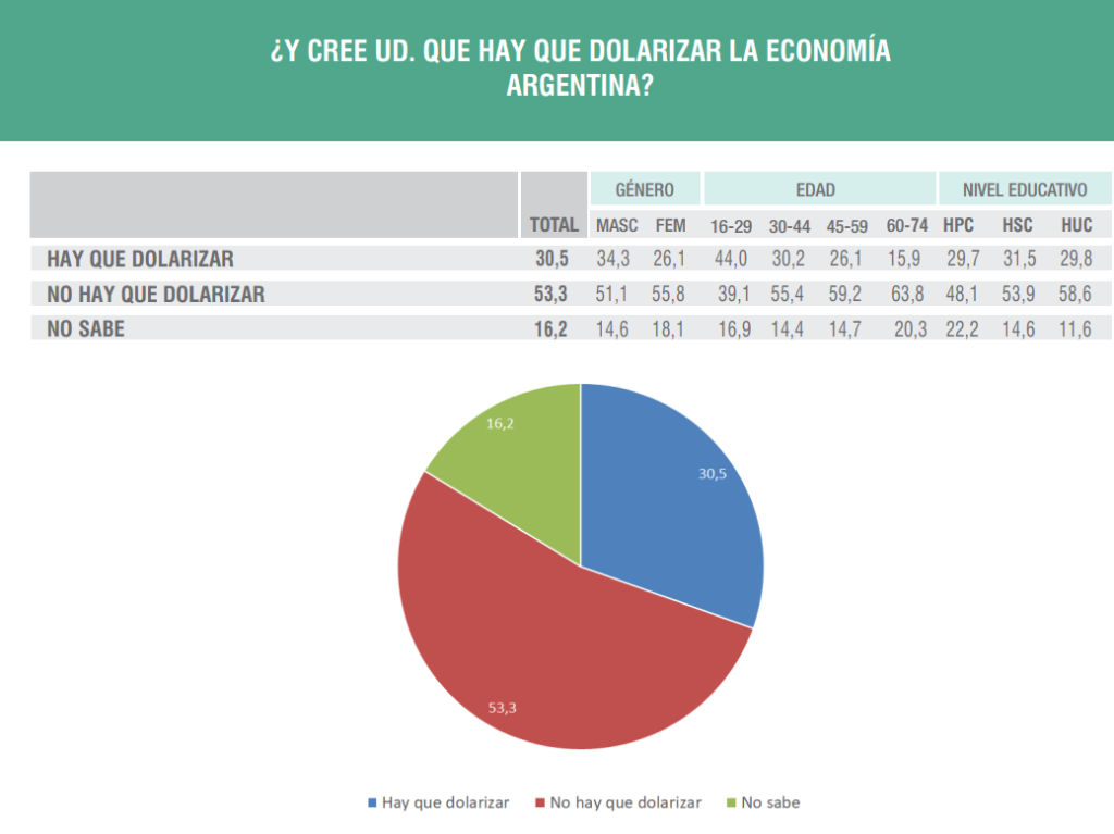Pero el dato más complicado que arroja la muestra de Analogías, es que el 53% de los consultados se pronunció en contra de la propuesta de dolarizar. El dato parece anticipar un fuerte rechazo a una medida que es sugerida desde buena parte del establishment de los Estados Unidos, aunque por ahora desaconsejada por el staff del Fondo Monetario.