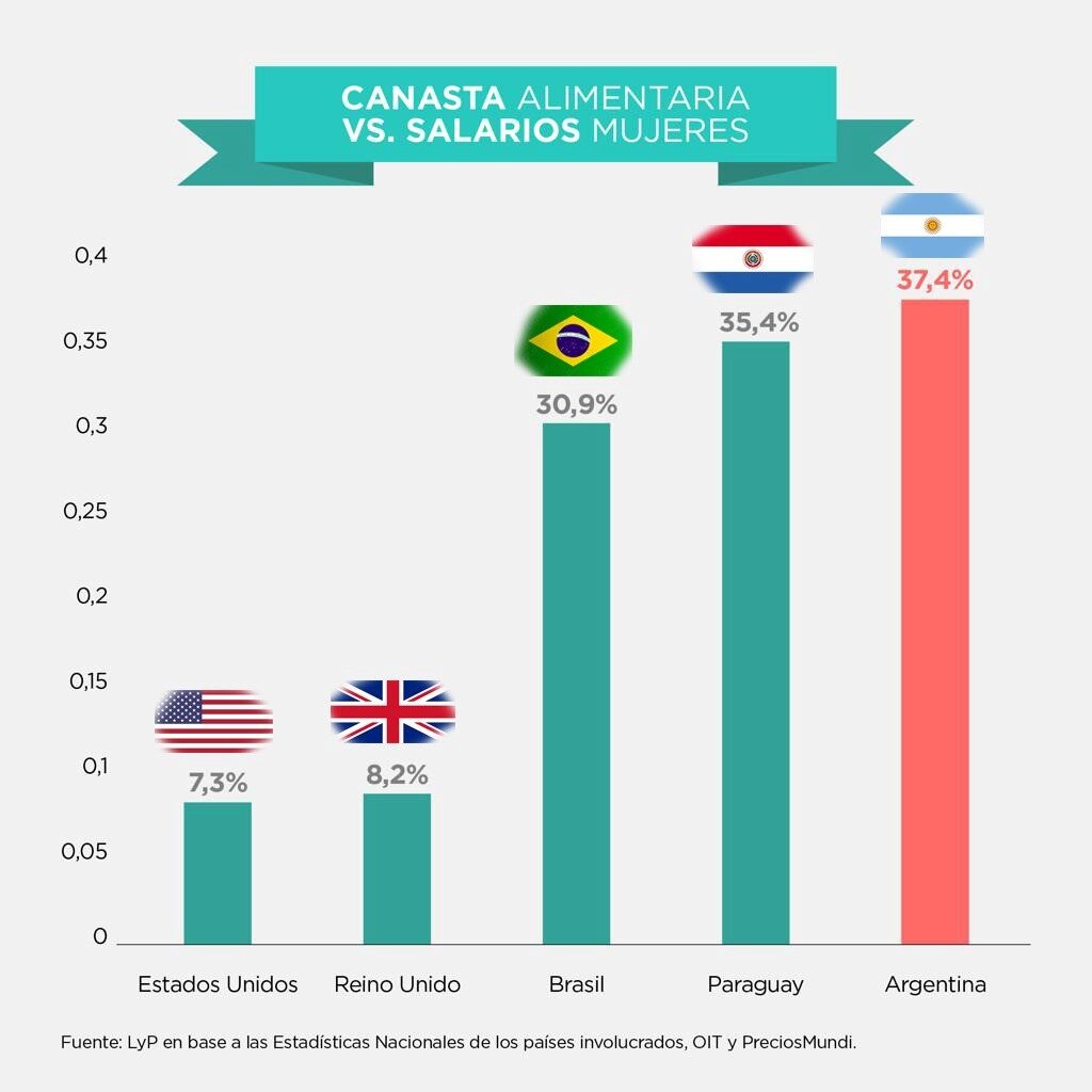 Según datos de la Organización Internacional de Trabajo (OIT), las mujeres argentinas ganan en promedio, a dólar oficial, unos US$446 por mes. En tanto, una canasta alimentaria para una sola persona, en dólares, se encuentra en los US$167 mensuales, a dólares oficial. Esto significa que el 37,4% del salario se gasta en necesidades básicas – sin contar el alquiler, estudios superiores privados, las tarifas de servicios o los impuestos.