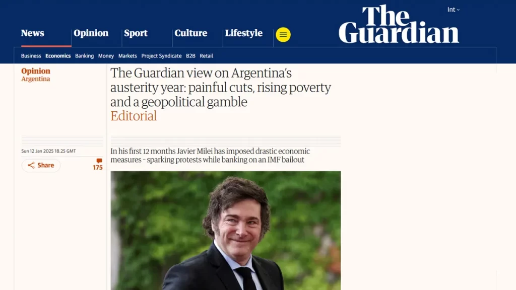 Con esta contundente editorial, The Guardian pone en el centro del debate internacional el impacto de las políticas de Javier Milei, un balance que, según el medio, deja un panorama sombrío para la Argentina.
